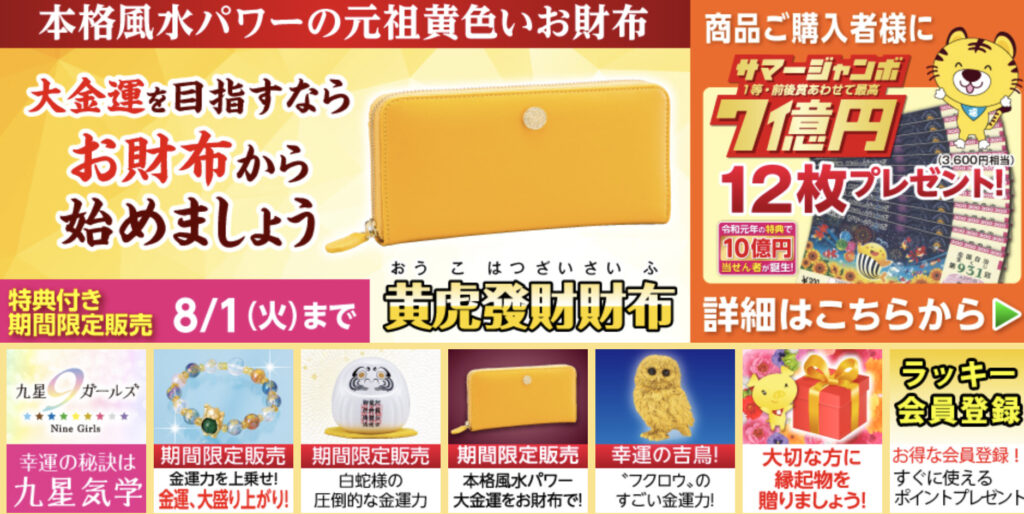 ラッキーショップは代表的風水グッズ『黄色い財布』の元祖と言われる黄虎發財財布をはじめ
