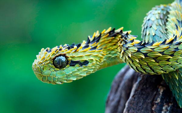 この蛇は、体全体を覆う長く尖った鱗がまるで「毛」のように見えるため「ヘアリー」と呼ばれおり、体色は緑の他にもレッド、イエローなどのバリエーションが存在し、またカモフラージュにも優れています。